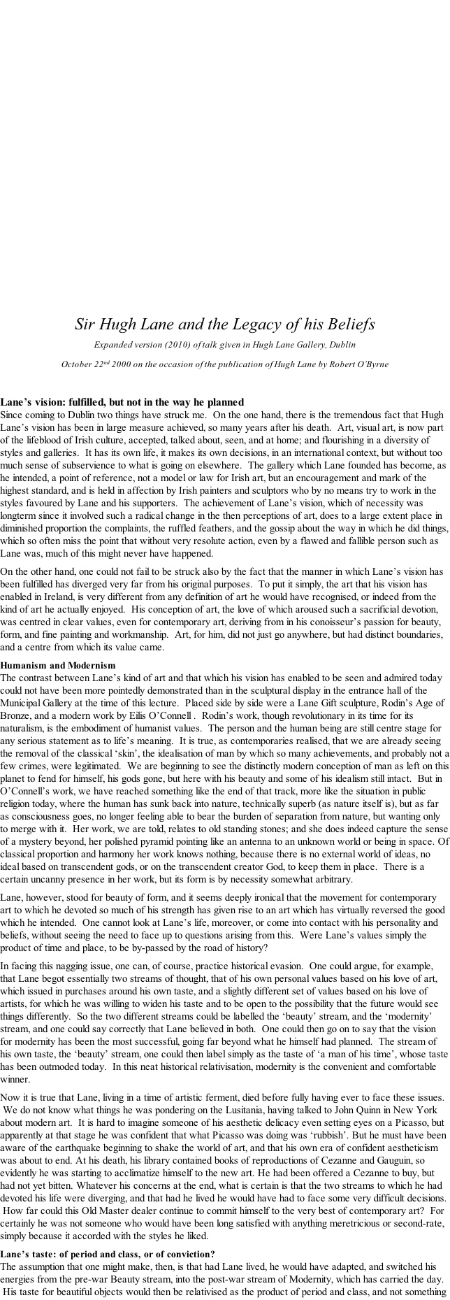 In 2000 a new biography was published by the Irish writer Robert O’Byrne, and on the occasion of its launch I was invited to give a lecture, in front of Mancini’s portrait of Lane, in the Hugh Lane Gallery of Modern Art in Dublin. As a family member (great nephew) who had read all the Lane papers now lodged in the National Library of Ireland and who had spent many years considering the legacy of his life and ideas, I attempted to bring into the present the pressing issues of beauty, taste and faith that he bequeathed.